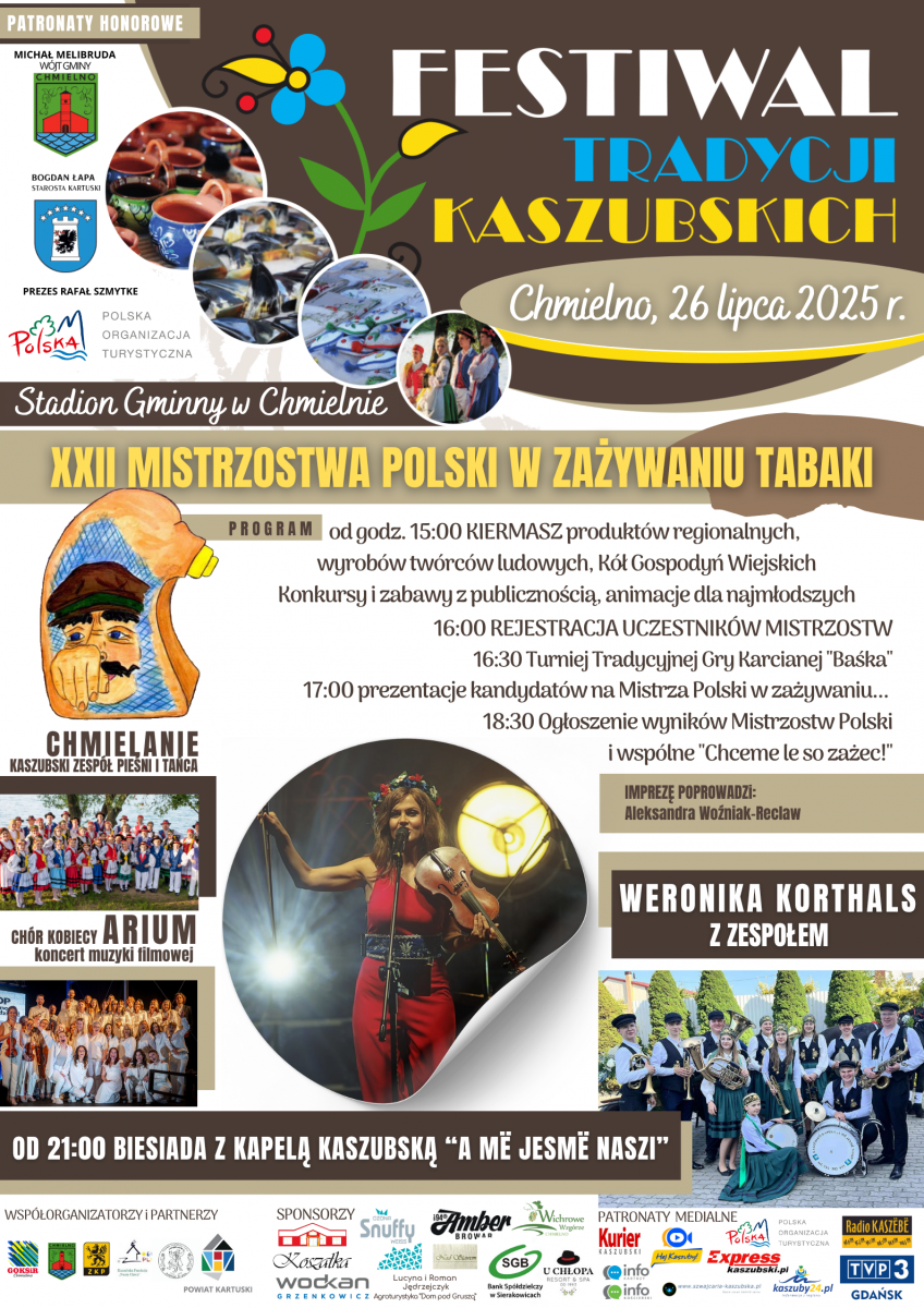 Zapraszamy na wyjątkowe święto kultury kaszubskiej! W sobotę 26 lipca w Chmielnie odbędzie się Festiwal Tradycji Kaszubskich, którego główną atrakcją będą XXII Mistrzostwa Polski w Zażywaniu Tabaki.
