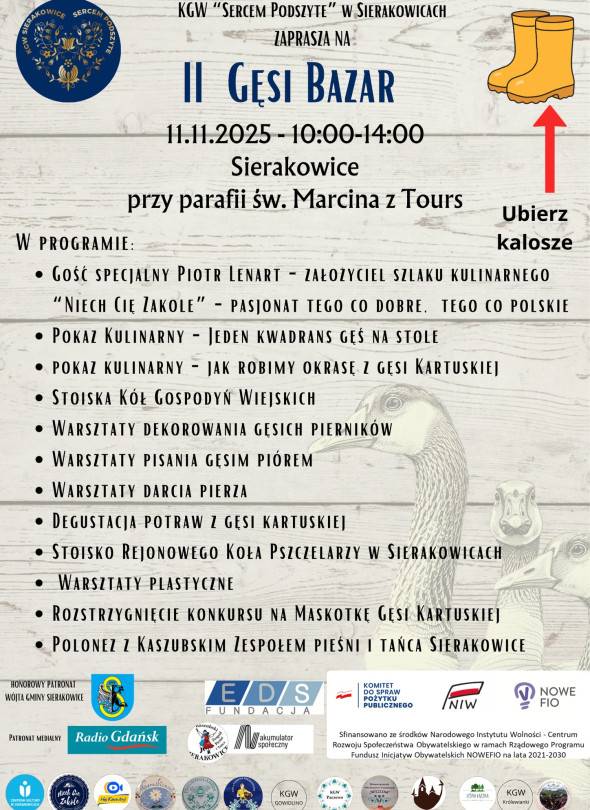 KGW Sierakowice "Sercem podszyte" zaprasza na II Gęsi Bazar. Wydarzenie rusza o godz. 10.00 na placu przy parafii pw. św. Marcina.